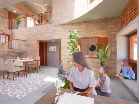 This project features a modern home blending traditional and contemporary design elements. The exterior combines stone and brick with spacious balconies, surrounded by greenery and open spaces that connect with nature. Inside, the open-plan layout with double-height areas and indoor plants creates a bright, airy atmosphere. With thoughtful seating, social spaces, and a dedicated prayer area, this home offers a harmonious balance of functionality, comfort, and cultural elegance.